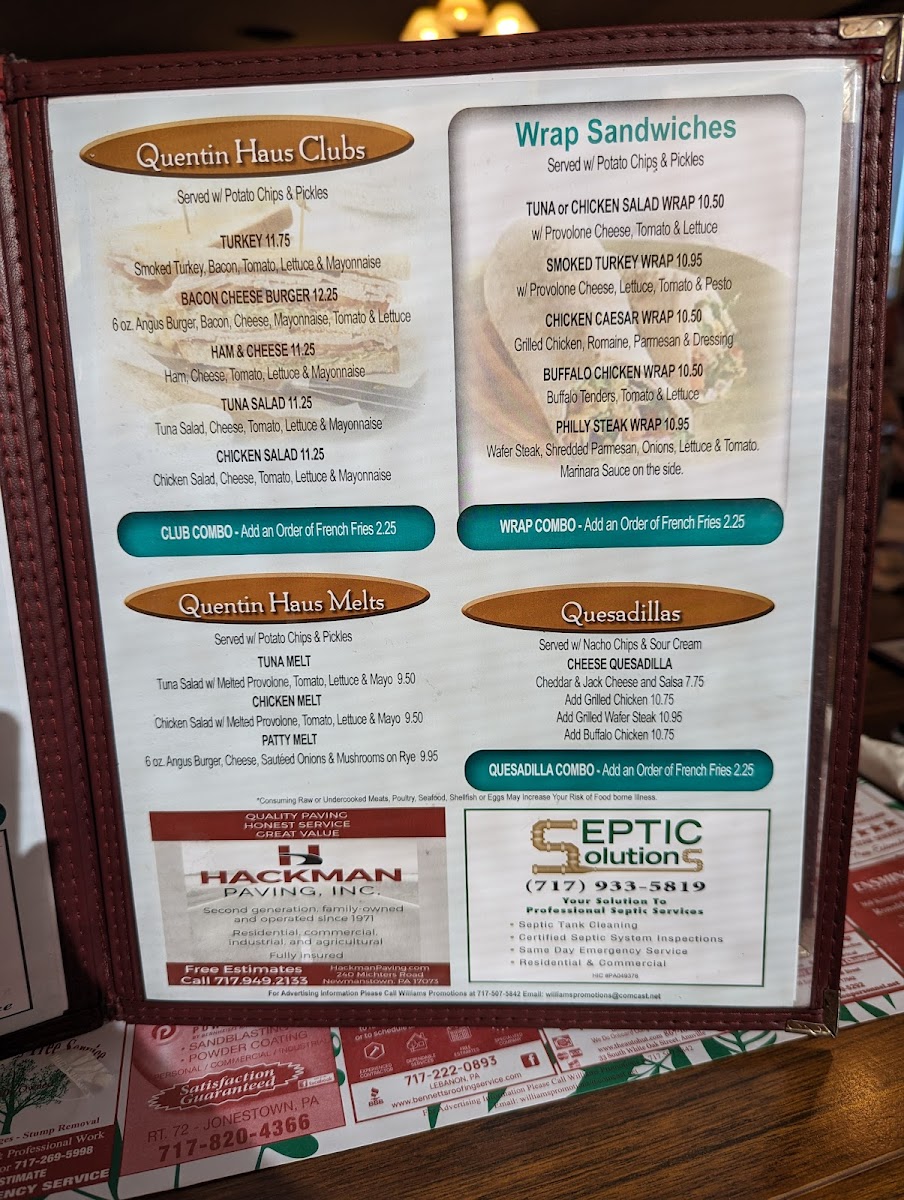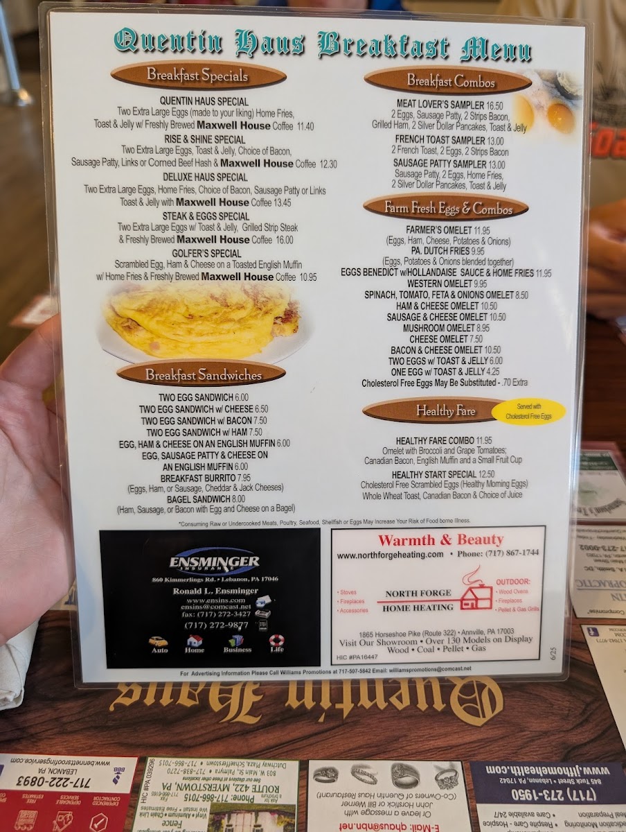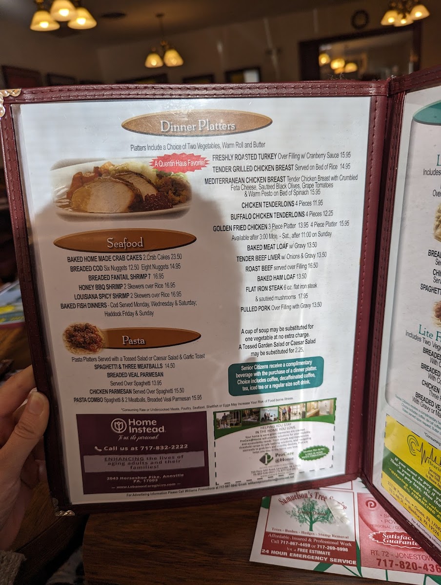 Welcome to Quentin Haus, a delightful dining gem located in Lebanon, PA. This eatery stands out for its diverse menu, offering everything from comforting breakfast options to hearty lunch specials. Breakfast favorites include toasted breads, oatmeal, and mouthwatering muffins, all served with a side of southern charm. For lunch, indulge in the chicken pot pie or the hot roast beef sandwich, favored by guests for generous portions and excellent taste.